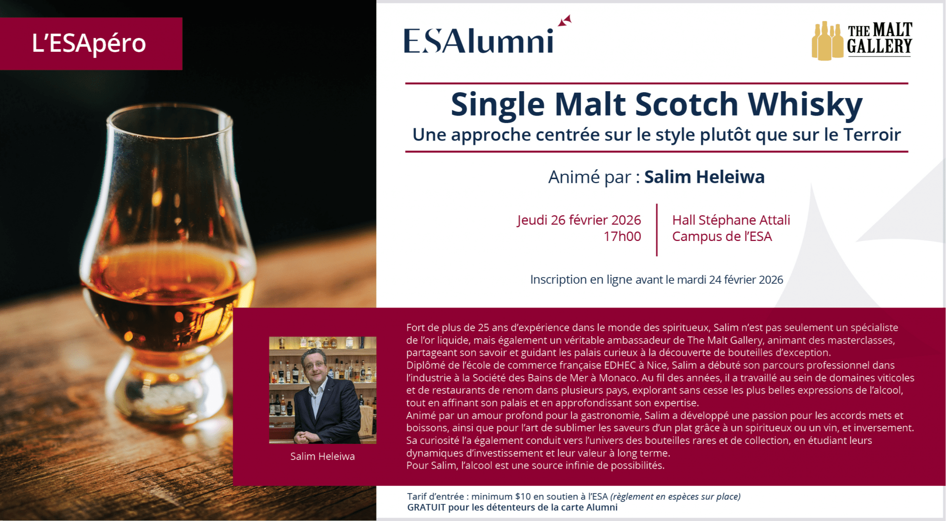 Fort de plus de 25 ans d’expérience dans le monde des spiritueux, Salim n’est pas seulement un spécialiste de l’or liquide, mais également un véritable ambassadeur de The Malt Gallery, animant des masterclasses, partageant son savoir et guidant les palais curieux à la découverte de bouteilles d’exception.