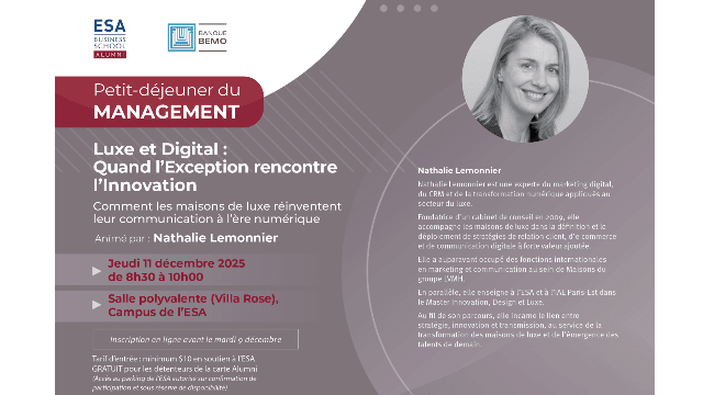 Dans le cadre des PETITS-DÉJEUNERS DU MANAGEMENT organisés par l'ESA Business School en partenariat avec la Banque Bemo